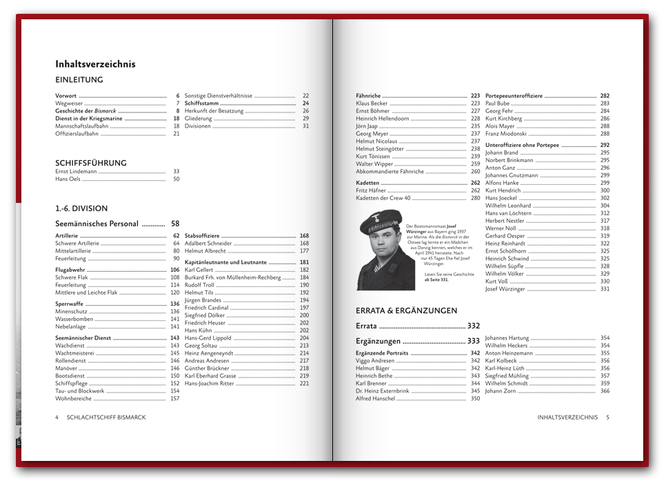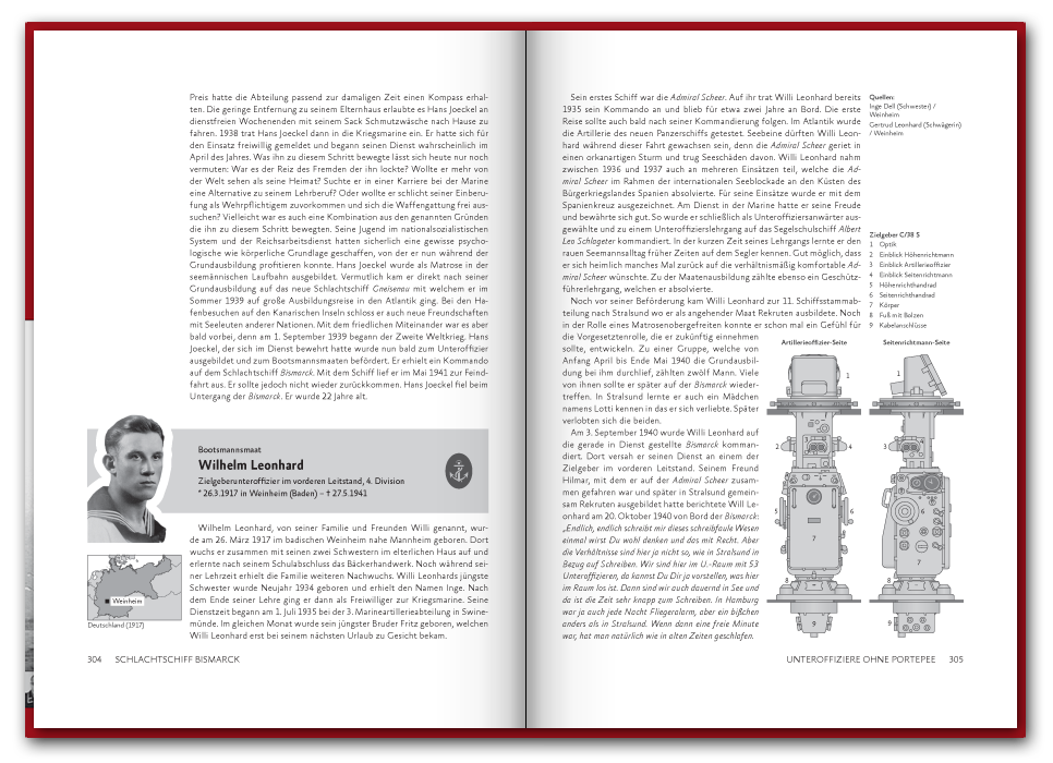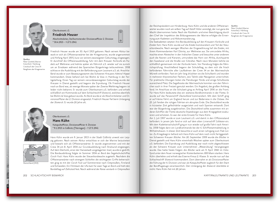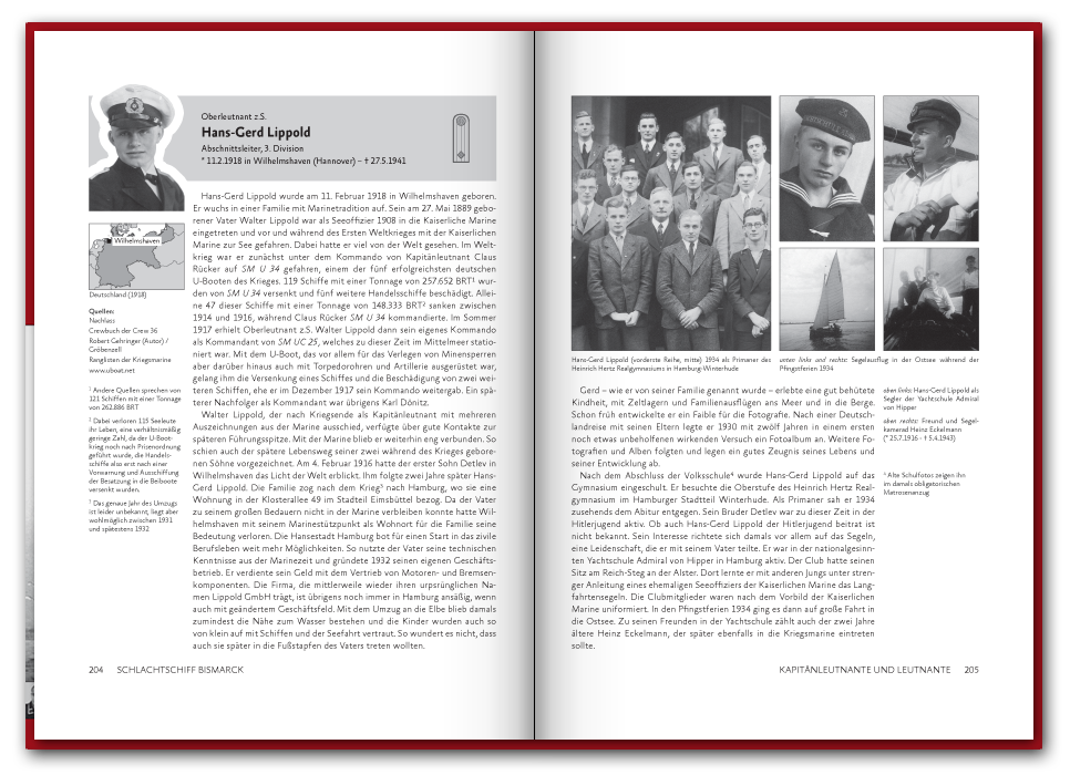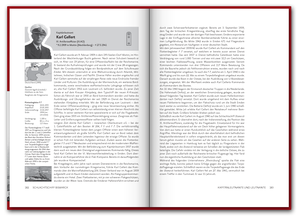Das 2016 erstmals erschienene 416 Seiten dicke Buch befasst sich mit der Schiffsführung, sowie den Offizieren und Unteroffizieren des Seemännischen Personals. In 74 Portraits stellen wir einzelne Besatzungsmitglieder vor, wie etwa den Bootsmannsmaaten Josef Würzinger der kurz vor dem Auslaufen heiratete und nach nur 45 Tagen Ehe fiel, oder die des Oberbootsmannsmaaten Gerhard Oesper der zur Marine ging um die Welt zu sehen und Gefallen am Dienst fand. Neben den spannenden Geschichten der Besatzungsmitglieder findet sich auch ein umfangreicher Abschnitt zu dem Fachbereich des Seemännischen Personals, in welchem vor allem die Schiffsartillerie, Flugabwehr und Feuerleitmittel ausführlich in Text und Bild vorgestellt werden. Einen Blick in das Buch können Sie unten in unserer Vorschau werfen und auf der Seite Besatzung auch schon einige Geschichten nachlesen.