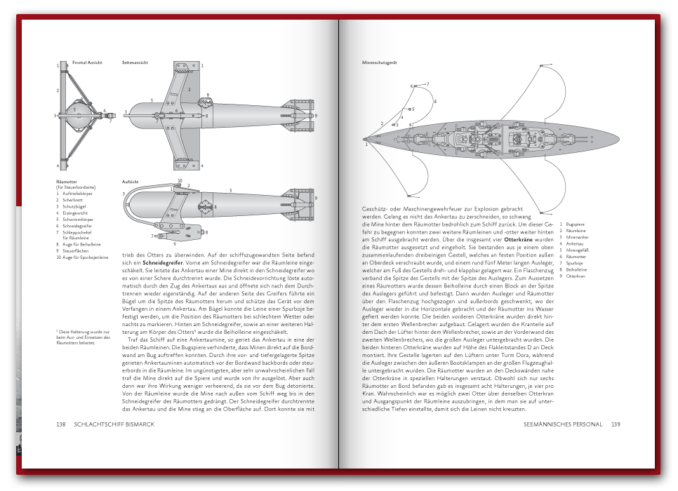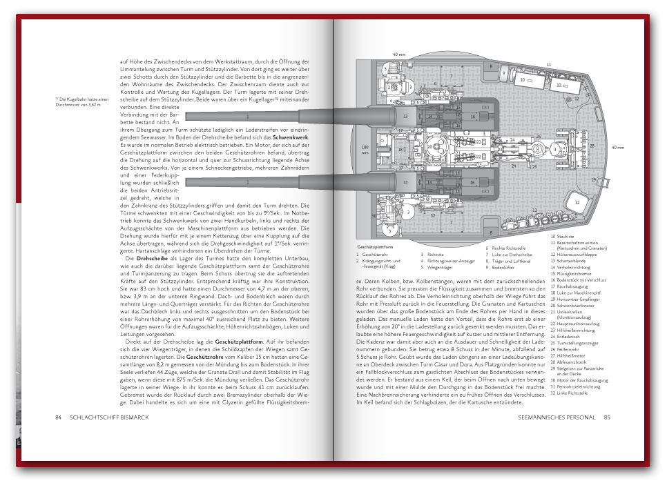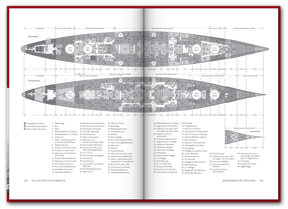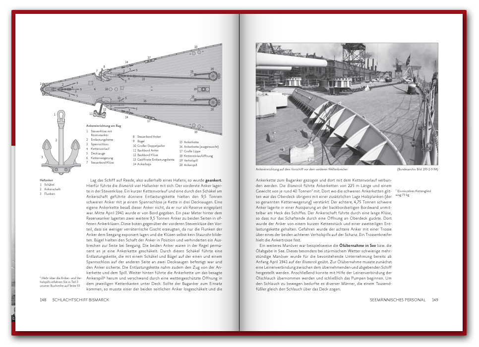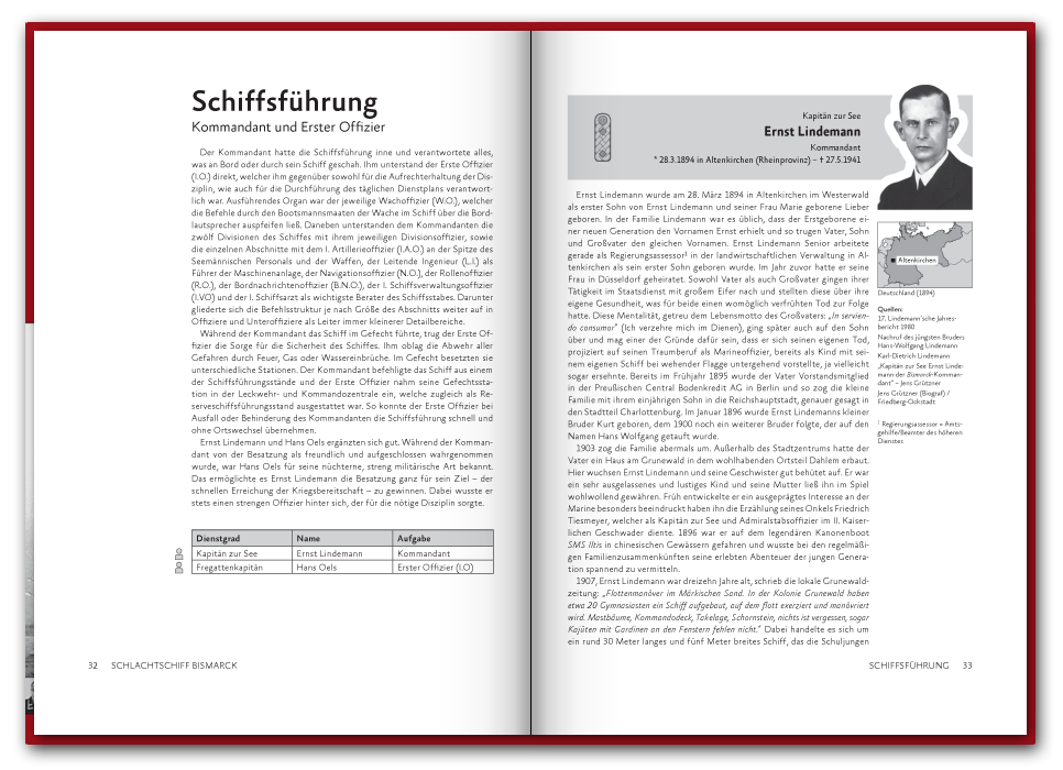 Das 2016 erstmals erschienene 416 Seiten dicke Buch befasst sich mit der Schiffsführung, sowie den Offizieren und Unteroffizieren des Seemännischen Personals. In 74 Portraits stellen wir einzelne Besatzungsmitglieder vor, wie etwa den Bootsmannsmaaten Josef Würzinger der kurz vor dem Auslaufen heiratete und nach nur 45 Tagen Ehe fiel, oder die des Oberbootsmannsmaaten Gerhard Oesper der zur Marine ging um die Welt zu sehen und Gefallen am Dienst fand. Neben den spannenden Geschichten der Besatzungsmitglieder findet sich auch ein umfangreicher Abschnitt zu dem Fachbereich des Seemännischen Personals, in welchem vor allem die Schiffsartillerie, Flugabwehr und Feuerleitmittel ausführlich in Text und Bild vorgestellt werden. Einen Blick in das Buch können Sie unten in unserer Vorschau werfen und auf der Seite Besatzung auch schon einige Geschichten nachlesen.