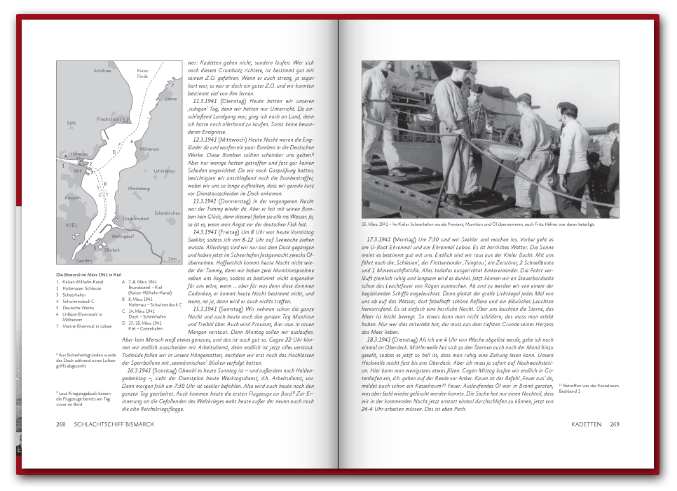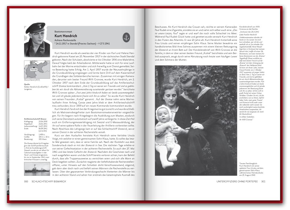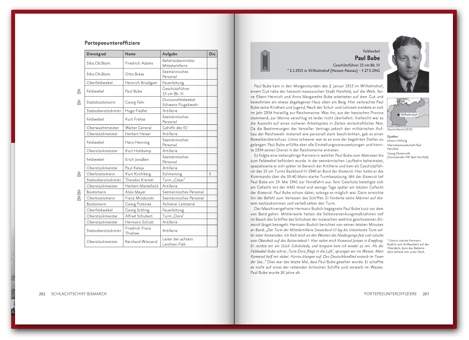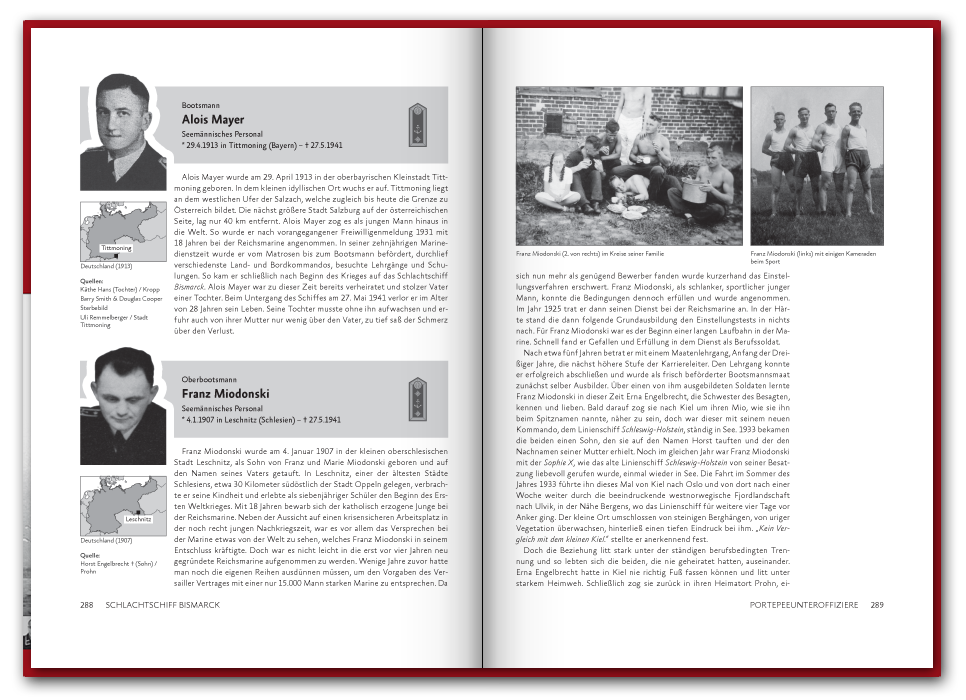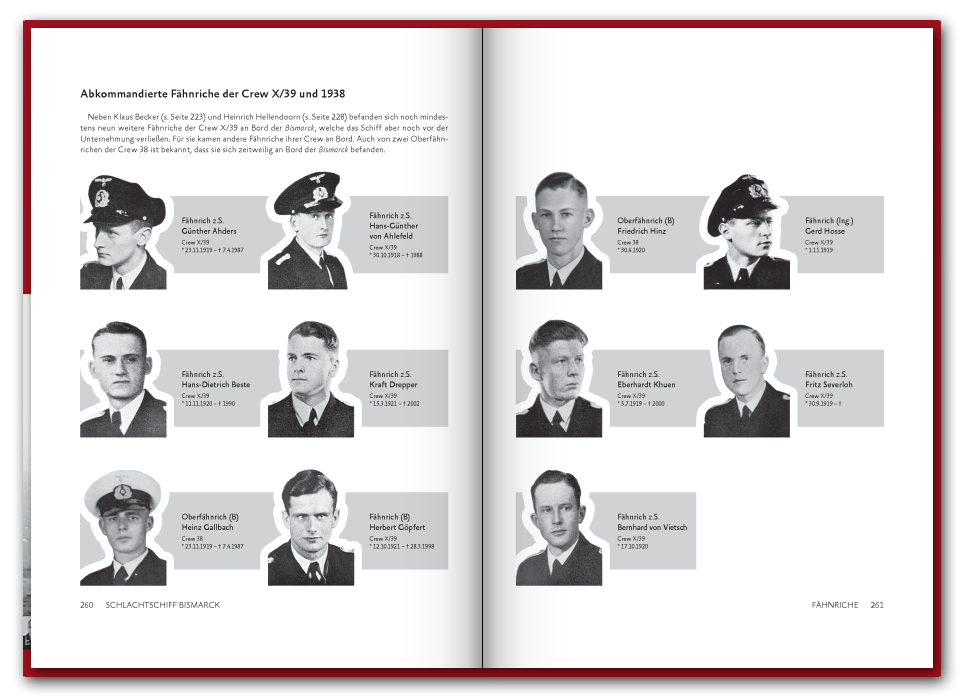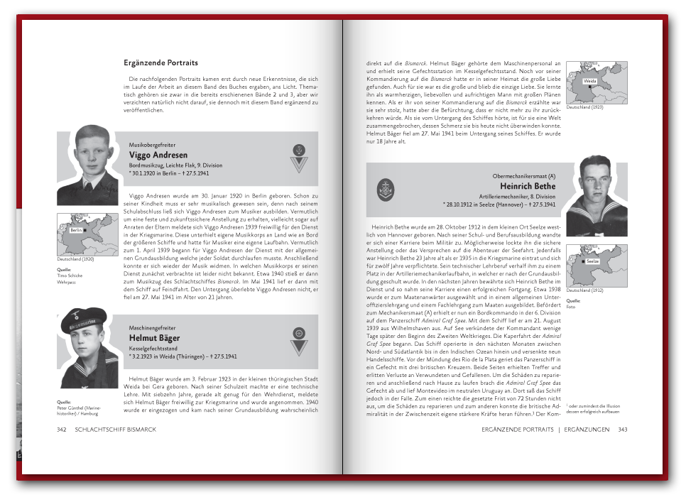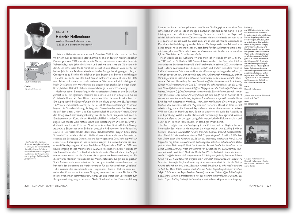 Im November 2019 haben wir den Band übrigens neu aufgelegt. Dabei ist das Buch um 48 Seiten auf insgesamt 416 Seiten gewachsen und enthält seit dem sechs weitere Portraits. Unter den neuen Geschichten ist die des Kapitänleutnants Karl Knappe, der in Spanien aufwuchs, als Offiziersanwärter in die Kriegsmarine eintrat, während des Spanischen Bürgerkrieges kämpfte und den Untergang der Blücher überlebte ehe er auf die Bismarck kam, oder die Geschichte des Oberstückmeisters Herbert Heiser aus Hamburg, welcher seit 1932 in der Marine diente und des Oberbootsmannsmaaten Hermann Dürkop aus Peine und sein spannendes Tagebuch von seiner Ausbildungsfahrt mit dem Segelschulschiff Gorch Fock.