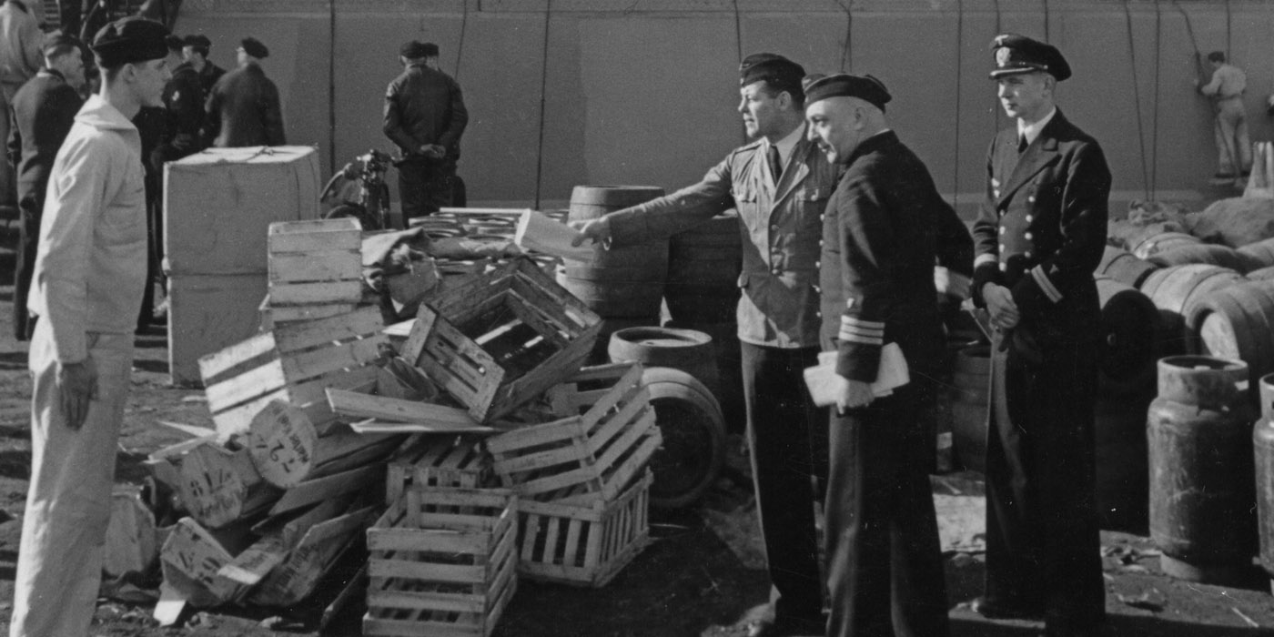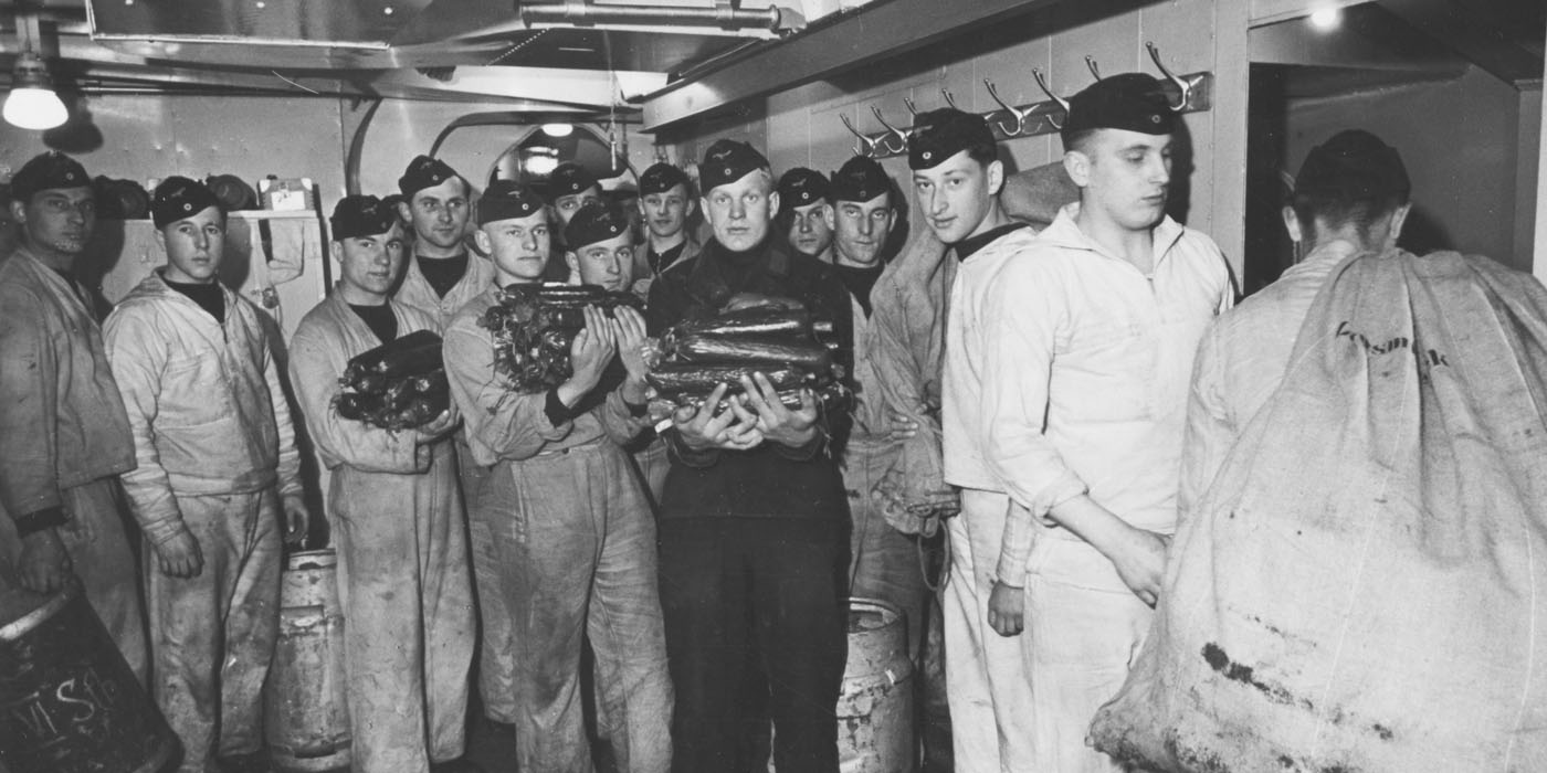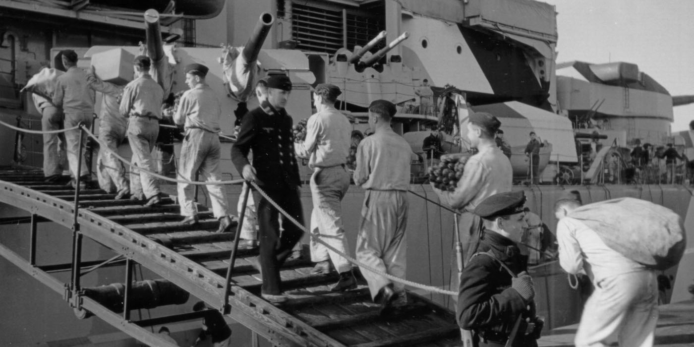 Seemämännisches Personal beim Arbeitsdienst (Verstauen von Versorgungsgütern). |
