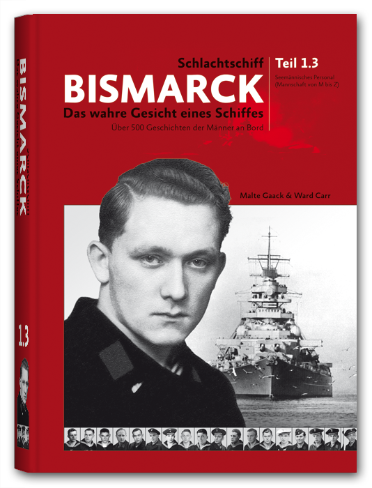 Als erstes Buch der Reihe "Schlachtschiff Bismarck - Das wahre Gesicht eines Schiffes" erschien 2011 unser Teil 3, der sich mit dem Maschinenpersonal, dem Zusatzpersonal mit den Bordfliegern und Zivilangestellten sowie den Sondergruppen (Flottenstab, B-Dienstgruppe, Prisenkommando und Kriegsberichterstatter), die sich extra für das Unternehmen "Rheinübung" auf der Bismarck einschifften, befasst. 436 Seiten umfasst der in einem Hardcovereinband für € 34,90 erhältliche Teil 3. In ihm finden sich die Geschichten von 114 Besatzungsmitgliedern des Schlachtschiffes Bismarck aus den zuvor genannten Fachbereichen. Wir erzählen etwa die Geschichte des Maschinengefreiten Herbert Engmann aus Hamburg St.-Pauli, welcher den Untergang der Karlsruhe überlebte auf die Bismarck kam und kurz vor dem Auslaufen wieder abkommandiert wurde und so überlebte, die des Fregattenkapitäns Paul Ascher der als I. Admiralstabsoffizier im Flottenstab treu diente und sogar nach dem Untergang der Admiral Graf Spee aus der südamerikanischen Internierung floh, obwohl er in Deutschland als so genannter "Halbjude" um sein Leben fürchten musste, oder die des jungen Matrosen II Richard Rebhan aus Lindenau der eigentlich zur Handelsmarine wollte und mit nur 17 Jahren fiel.
