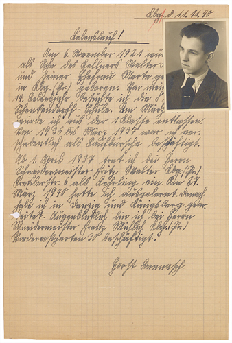 Horst Bannasch was born on November 6, 1921 in the East Prussian state capital Königsberg as the son of Marta, née Naumann, and Walter Bannasch. The family lived at Heidemannstraße 26, a cobbled street east of the center of Königberg. The bank of the new Pregel was only a few meters away, as was the Waisenplatz with the university clinic grounds of the Löbenichtschen Hospital, the Sackheimer Tor and the park on the former city wall. Five-story apartment blocks with attic apartments and a few shops on the ground floor dominated the streetscape. The parents Marta and Walter Bannasch got married a year before the birth of what was probably their first child. The then 34-year-old father earned his living as a waiter. His wife, who was eleven years jounger, probably took care of the household and children as a housewife and mother. At the age of six, Horst Bannasch started school at the Schenkendorff School, which he attended for eight years until the 1st grade and the age of 14. After graduating from school in March 1936, he did various odd jobs as an errand boy before getting an apprenticeship a year later.
