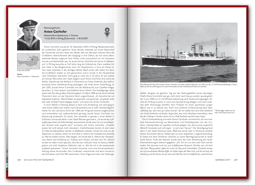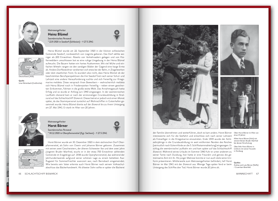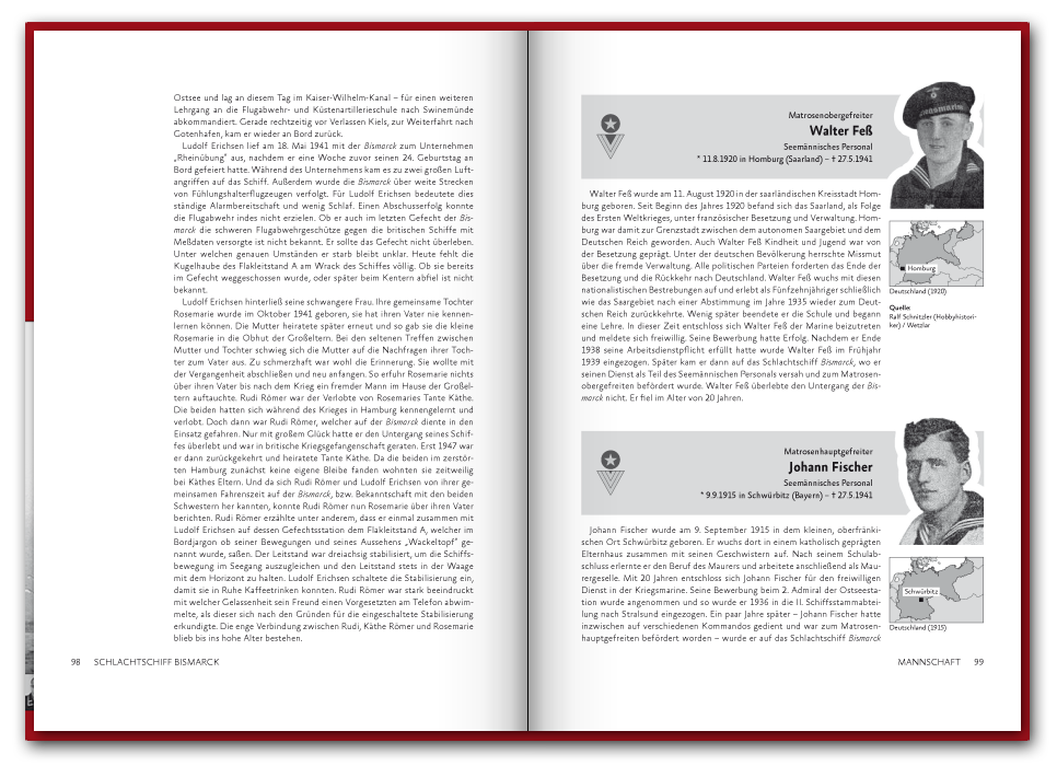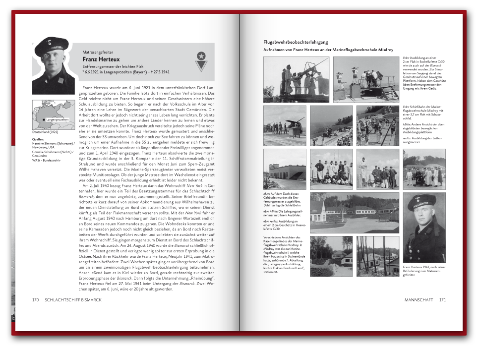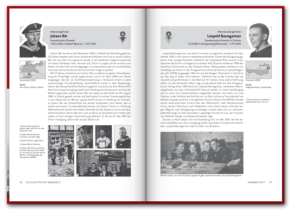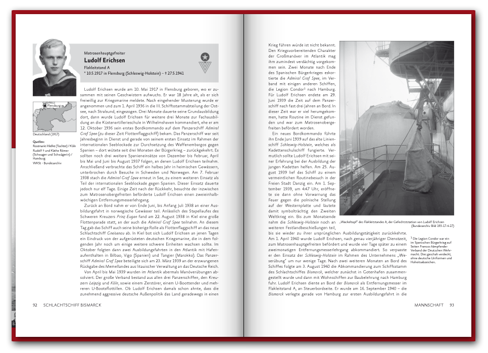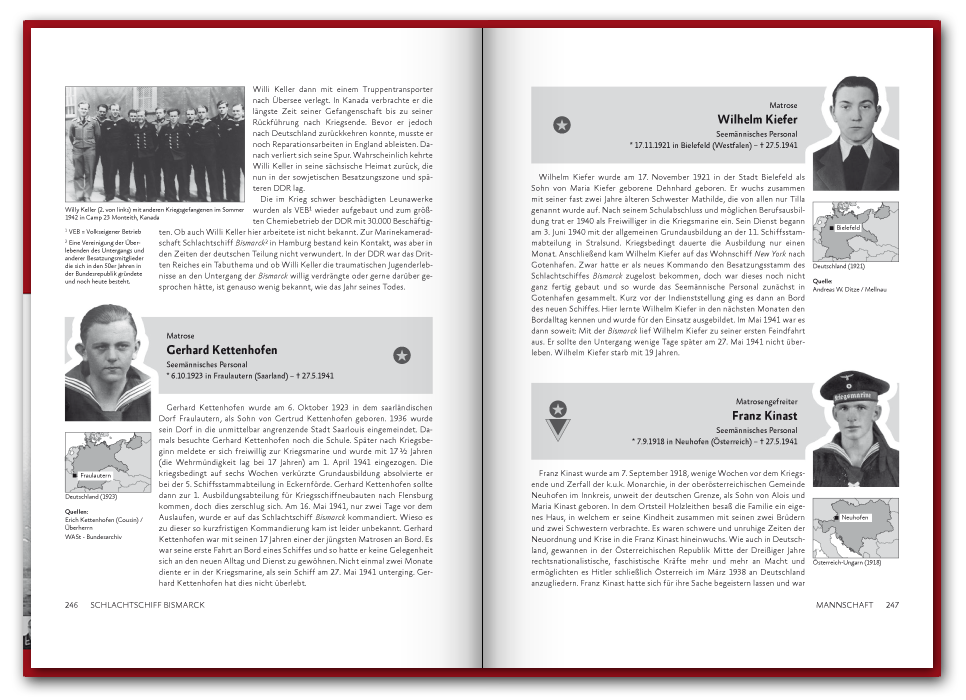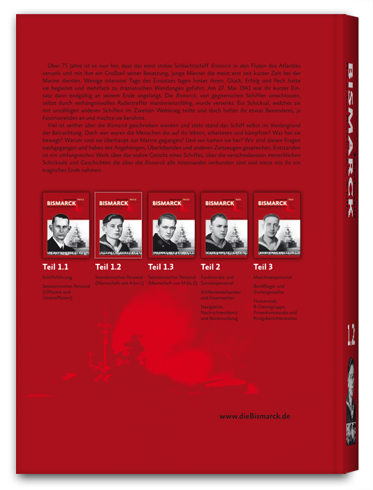 Mit dem Teil 1.2 unserer Buchreihe erzählen wir die umfangreiche Geschichte des Seemännischen Personals weiter. Dieses machte mit über 1.000 Mann mehr als die Hälfte der gesamten Besatzung aus und füllt ganze drei Bücher unserer Serie. Der am 27. Mai 2020 zum 79. Jahrestag des Untergangs der Bismarck erschienene Teil 1.2 umfasst alleine 400 Seiten und ist damit dicker als die Erstauflage seines Vorläufers, des Teil 1.1. In ihm erzählen wir die persönlichen Geschichten der Mannschaft vom einfachen Matrosen bis zum Matrosenhauptgefreiten des Seemännischen Personals mit den Nachnamen beginnend bei A bis L. Es finden sich die spannenden Geschichten von 134 Besatzungsmitgliedern, wie etwa die des jungen Österreichers Alois Bacher der die Exotik der Seefahrt sucht oder dem erfahrenen Matrosenhauptgefreiten Kurt Langerwisch aus Brandenburg, der den Untergang mit viel Glück überlebte und später in der DDR Lehrer und Schuldirektor wurde.