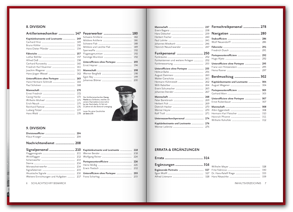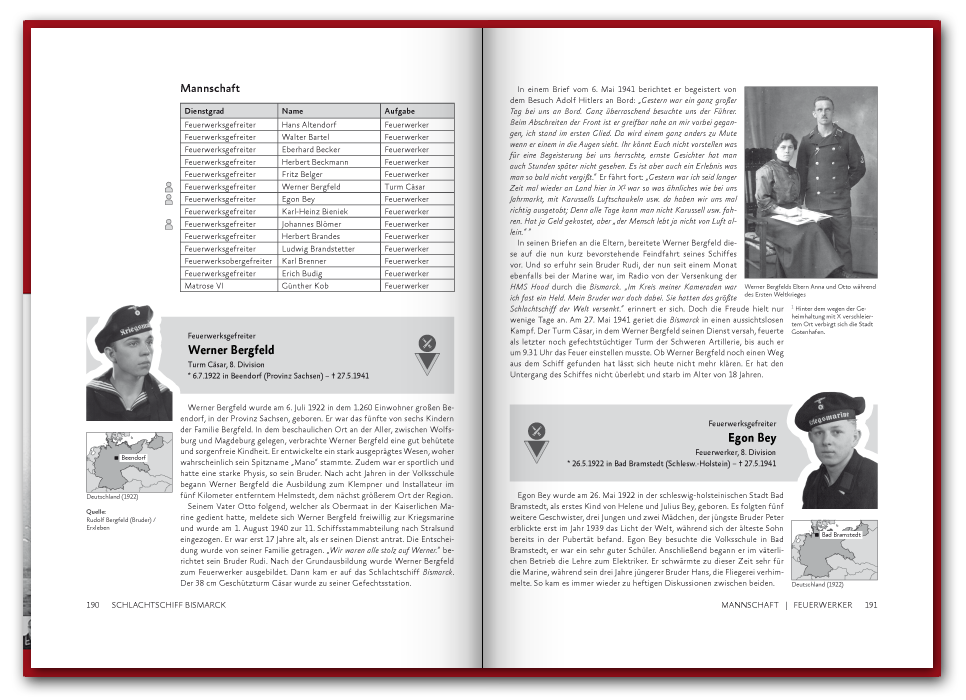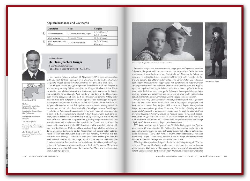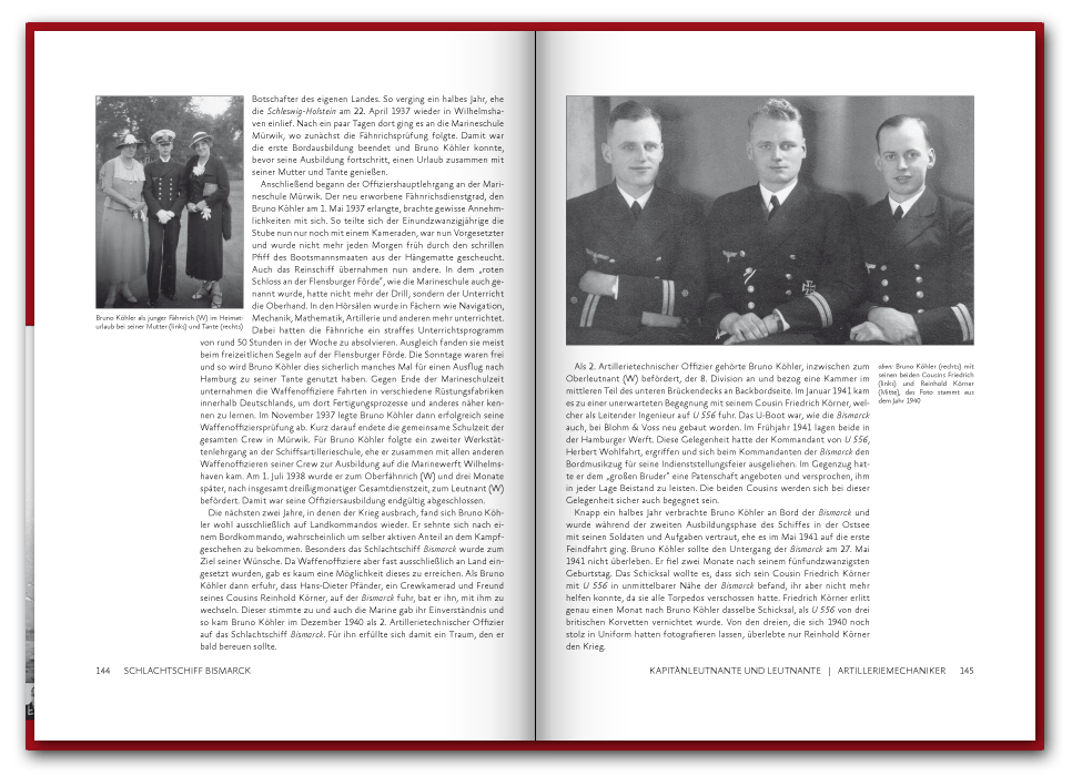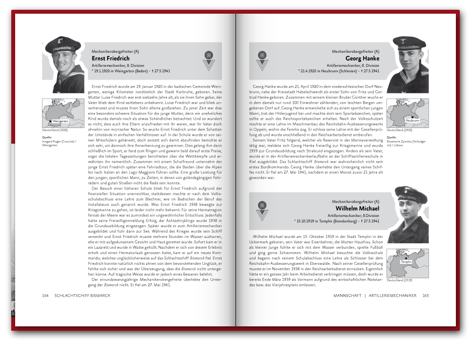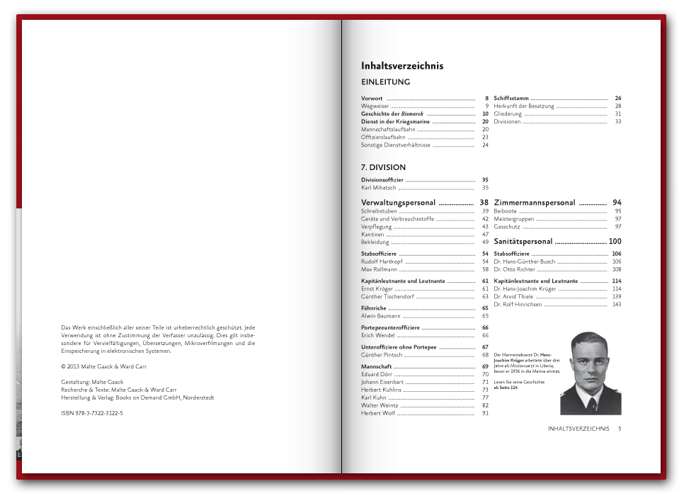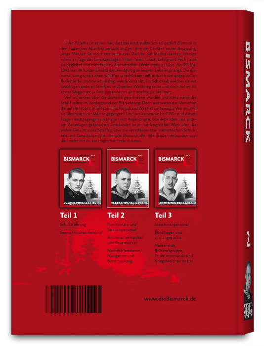 Nach langer Arbeit entstand im Mai 2013 unser zweites Buch "Schlachtschiff Bismarck - Das wahre Gesicht eines Schiffes Teil 2". Auf 340 Seiten stellen wir darin die Geschichten von 84 Besatzungsmitgliedern der Fachabschnitte vor. Darunter viele spannende Geschichten, wie die des Marinestabsarztes Dr. Hans-Joachim Krüger, der vor seiner Marinezeit als Missionsarzt im afrikanischen Busch arbeitete oder die von Oberleutnant (W) Bruno Köhler der mit einem Freund das Kommando tauschte um auf die Bismarck zu kommen. Weiter unten in der Vorschau können Sie einen Blick in das Buch werfen und unter dem Reiter Besatzung auch einige ausgewählte Geschichten nachlesen.