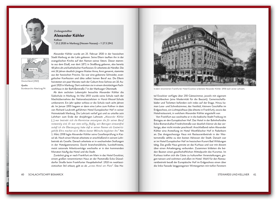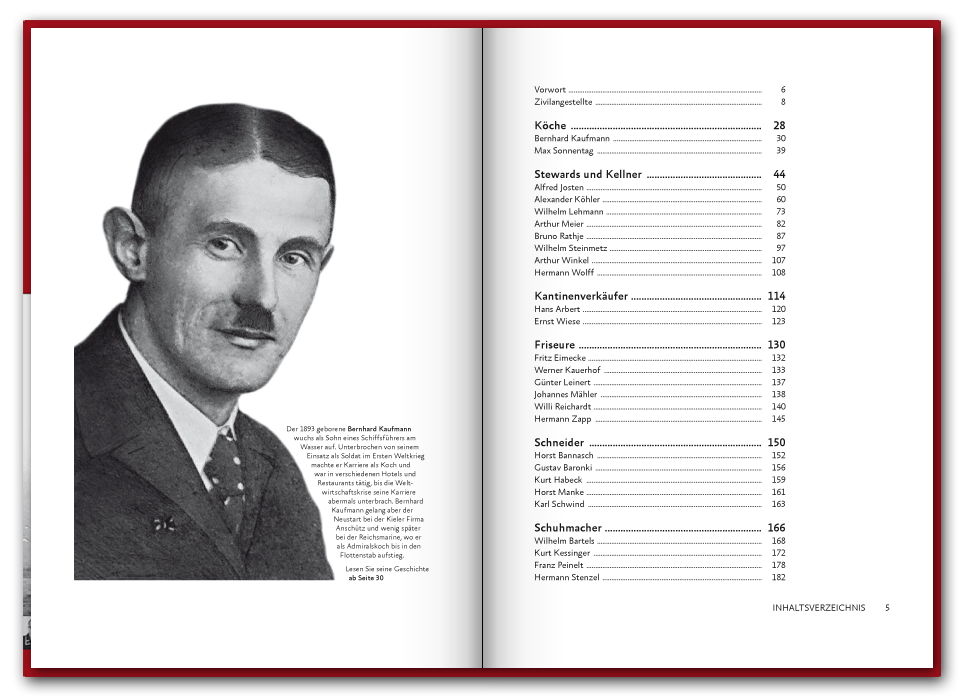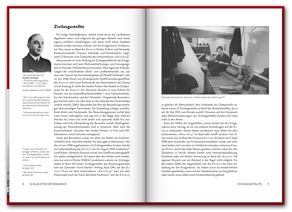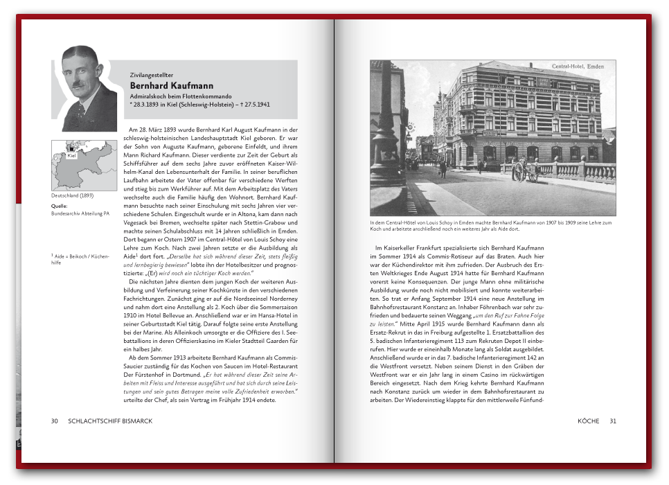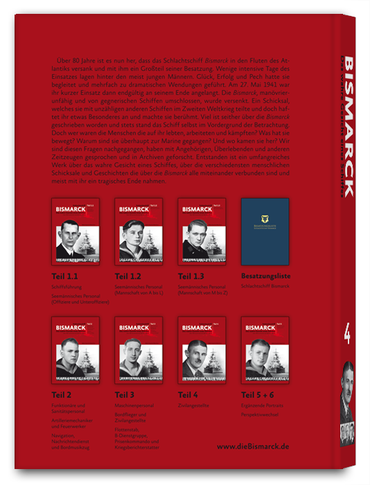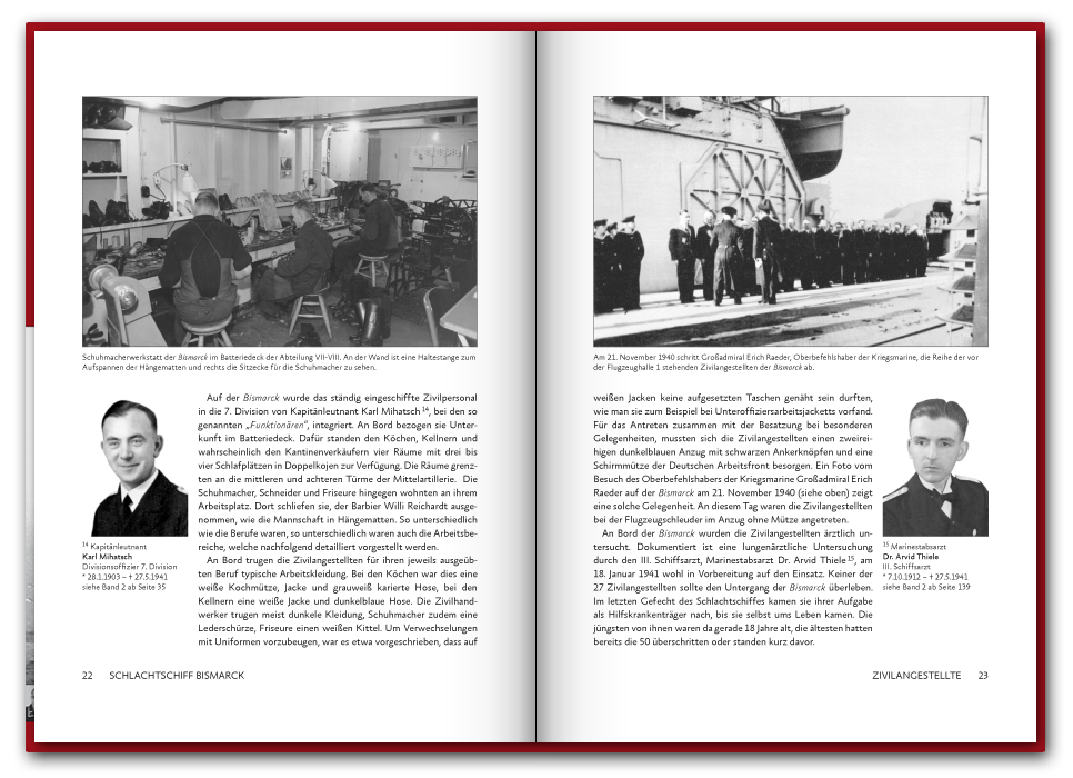 Bisher war es uns nicht gelungen auch ein Portrait von einem der 27 an Bord beschäftigten Zivilangestellten zu zeichnen, die als Köche, Schneider, Schumacher, Kantinenverkäufer oder etwa Friseure und Stewards ihre Arbeit an Bord des Schlachtschiffes verrichteten. So erschien der Band 3 vor über zehn Jahren zwar mit dem Abschnitt der Zivilangestellten, jedoch ohne ein einziges Portrait. Das hat sich mittlerweile grundlegend geändert. Dank des Bundesarchives und weiterer Quellen konnten wir nun die Geschichten aller 27 Zivilangestellten recherchieren und wollen ihnen einen etwas schmaleren Sonderband widmen.